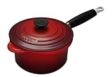 Fonte émaillée rouge, Manche phénolique résistant, à la chaleur et au lave-vaisselle, Poignée d'assistance, Tous feux dont induction, Diamètre : 20 cm, Capacité : 2,5 L, Couvercle avec bouton en bakélite, Couleur : cerise, Bord anti-goutte : becs verseurs, pour droitiers et gauchers, Crochet inox de suspension :, ne rouille pas
